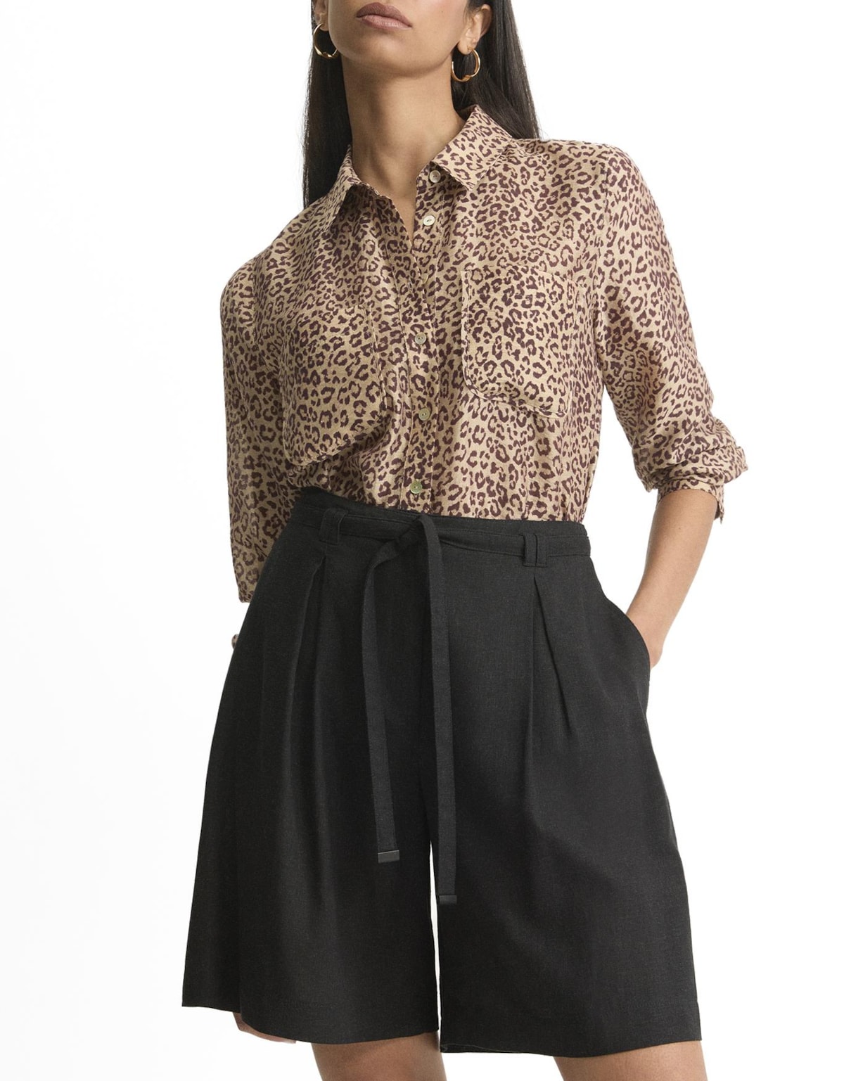 Bermuda alfaiatada com cintura alta, confeccionada em linho com viscose, oferecendo leveza e caimento elegante.