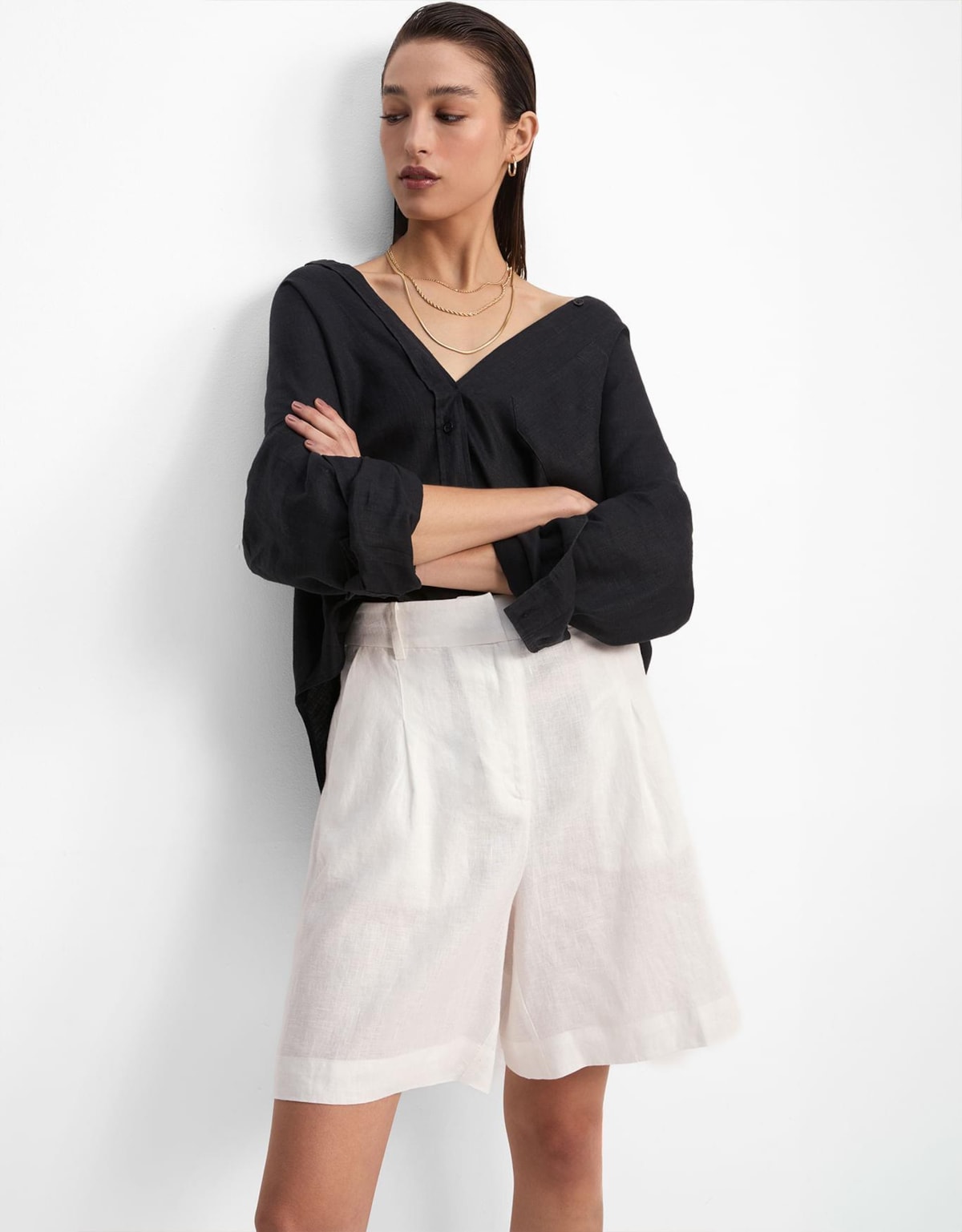 O shorts de linho alfaiataria Shoulder combina elegância, conforto e acabamento impecável.