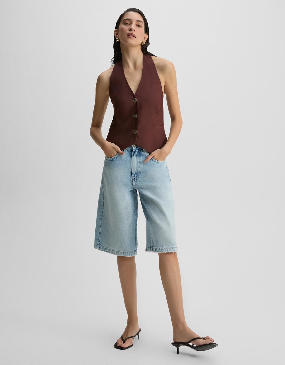 Bermuda feminina confeccionada em jeans, desenvolvida para compor produções casuais com estética contemporânea e versátil.