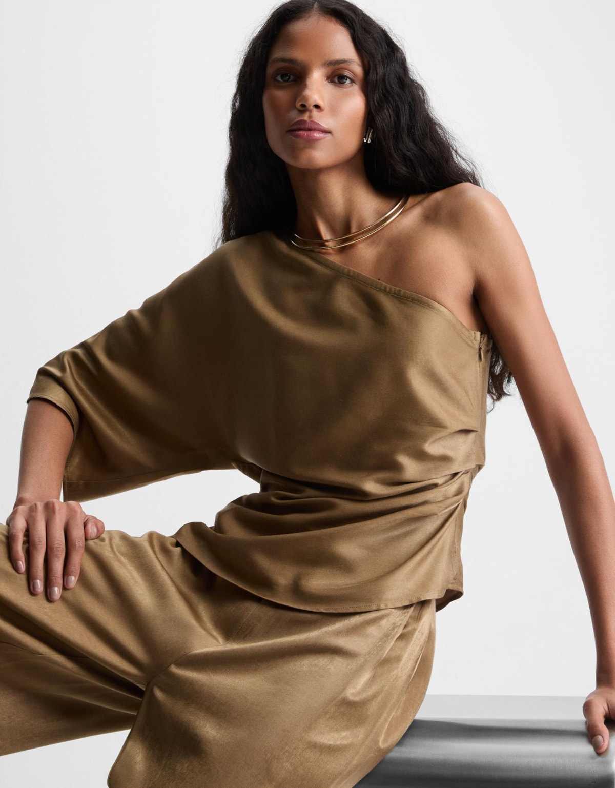 A Blusa Shoulder em cetim levemente encorpado combina sofisticação e feminilidade em uma peça moderna e elegante.