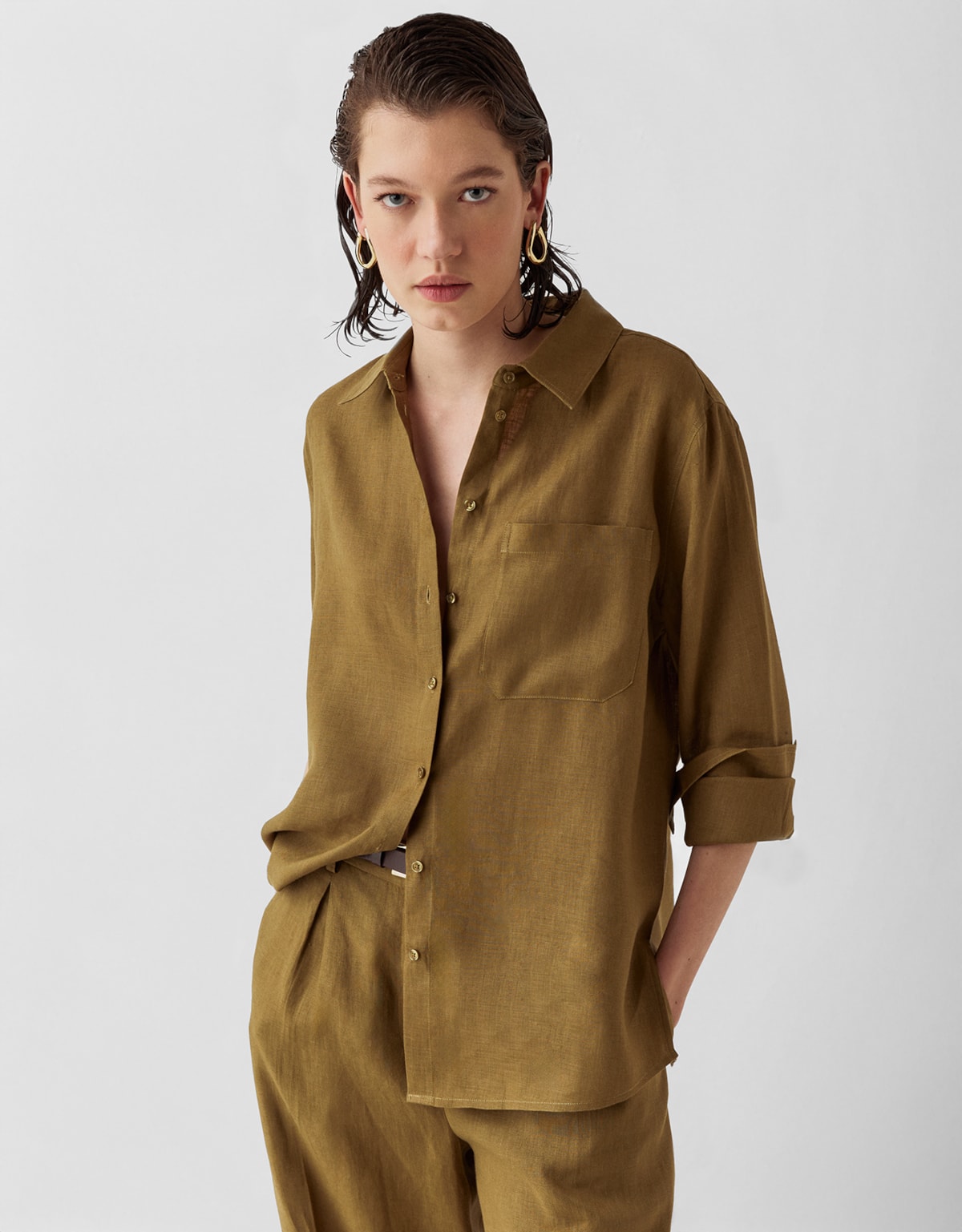 A camisa feminina em linho na cor verde oliva é uma peça elegante e atemporal, ideal para compor produções sofisticadas com leveza e conforto.