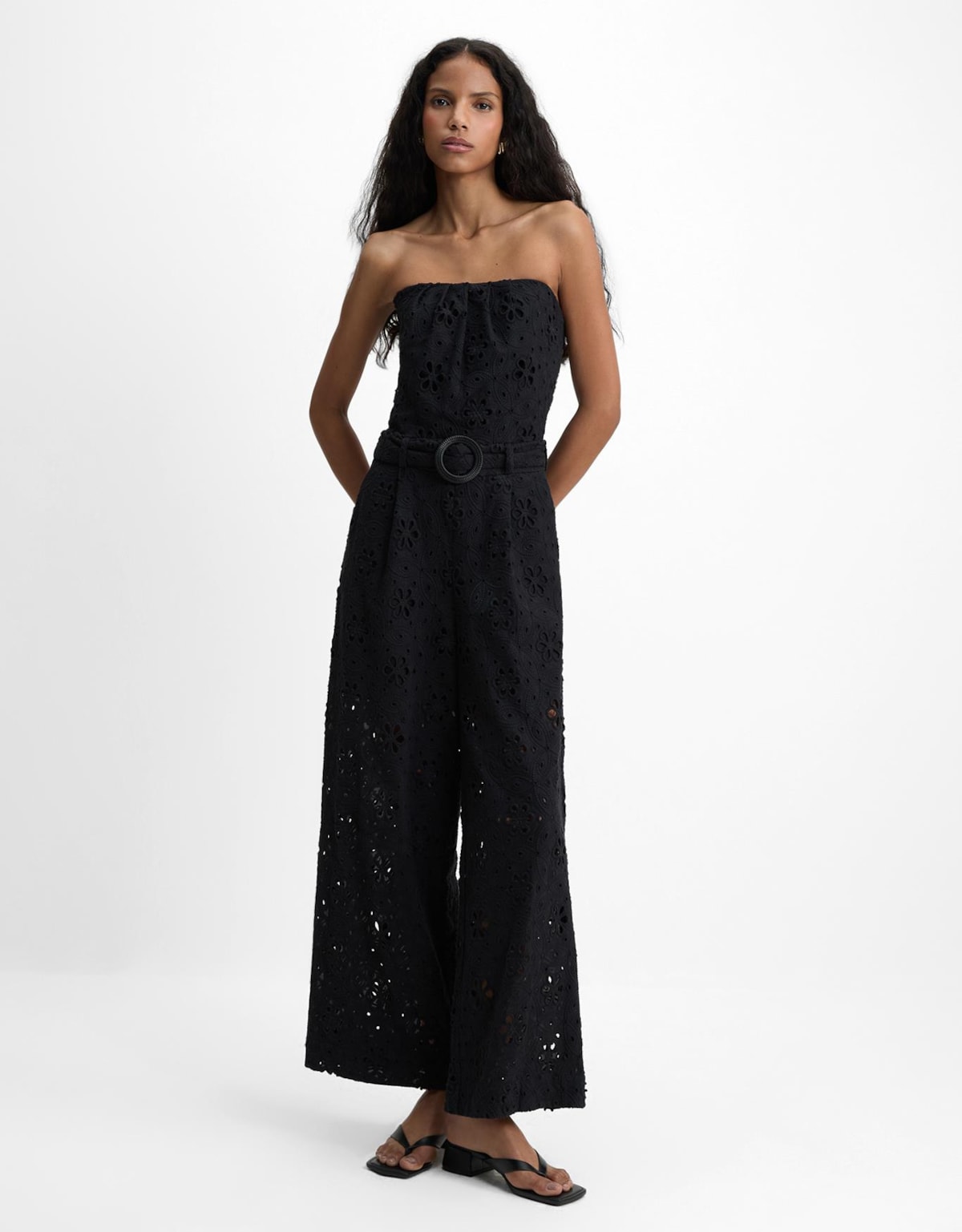 O decote tomara que caia, combinado ao tecido em laise com bordados vazados, cria uma proposta feminina e delicada, trazendo leveza e frescor ao look.