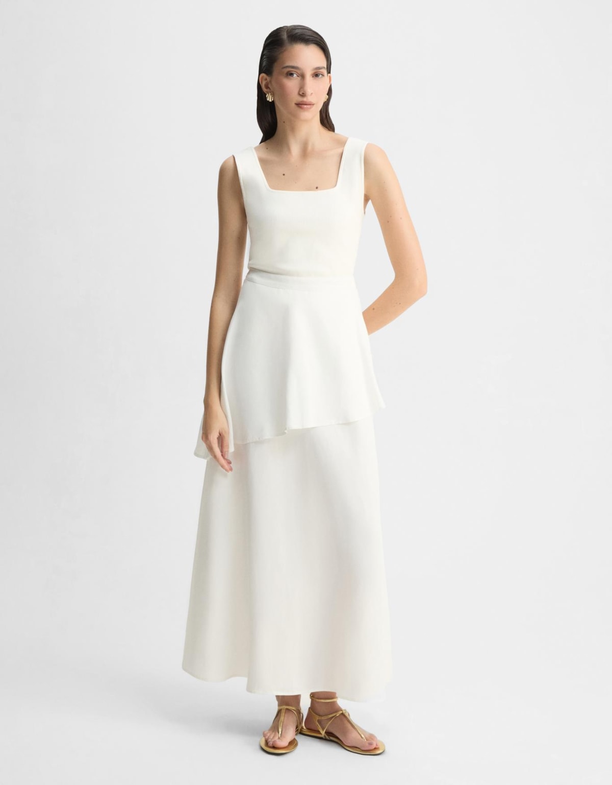 A Saia Midi Shoulder em tecido natural de linho com viscose e toque acetinado é uma peça elegante e atemporal, ideal para produções sofisticadas do dia à noite.