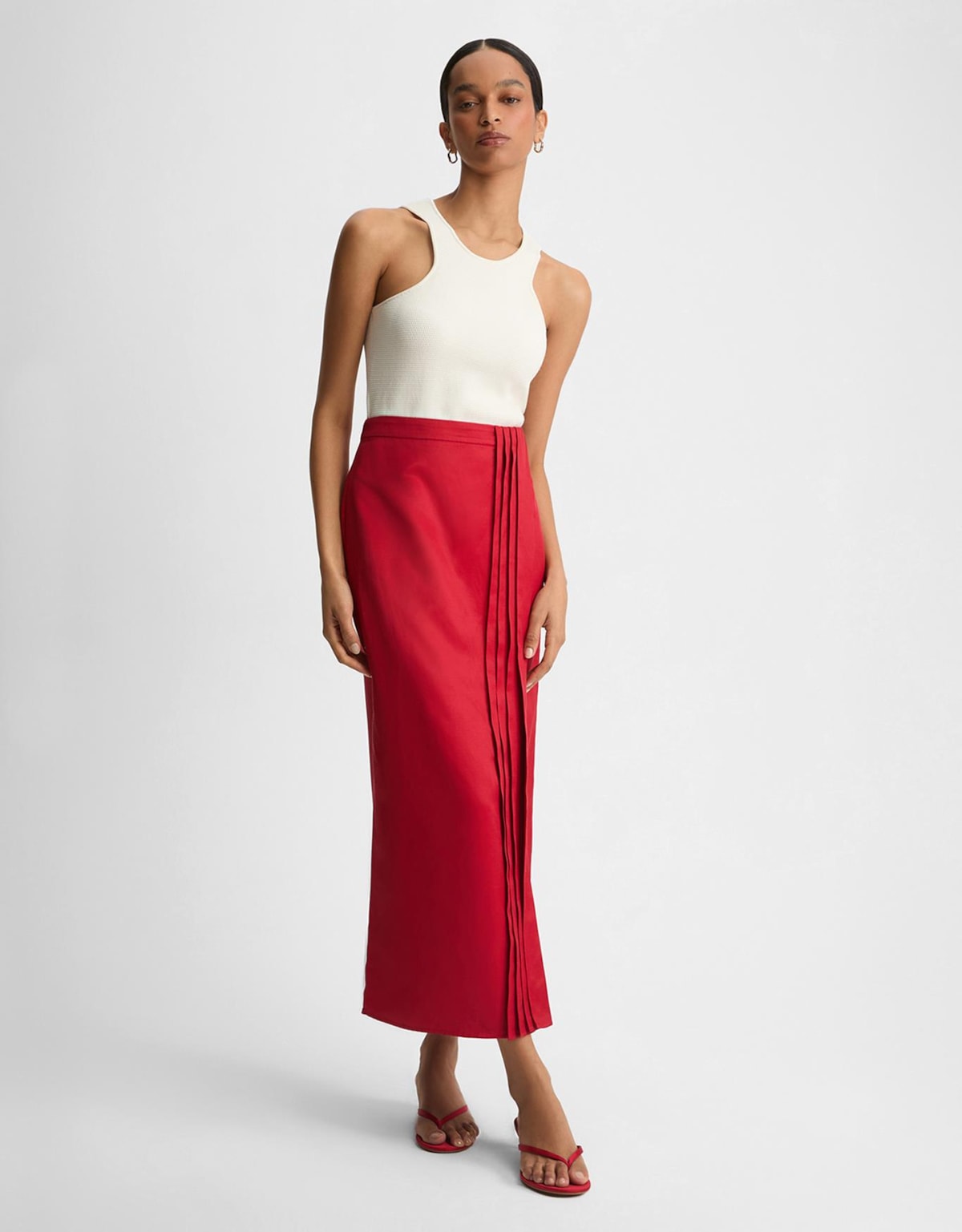 Saia feminina de comprimento midi, desenvolvida para compor produções elegantes com estética contemporânea e sofisticada.