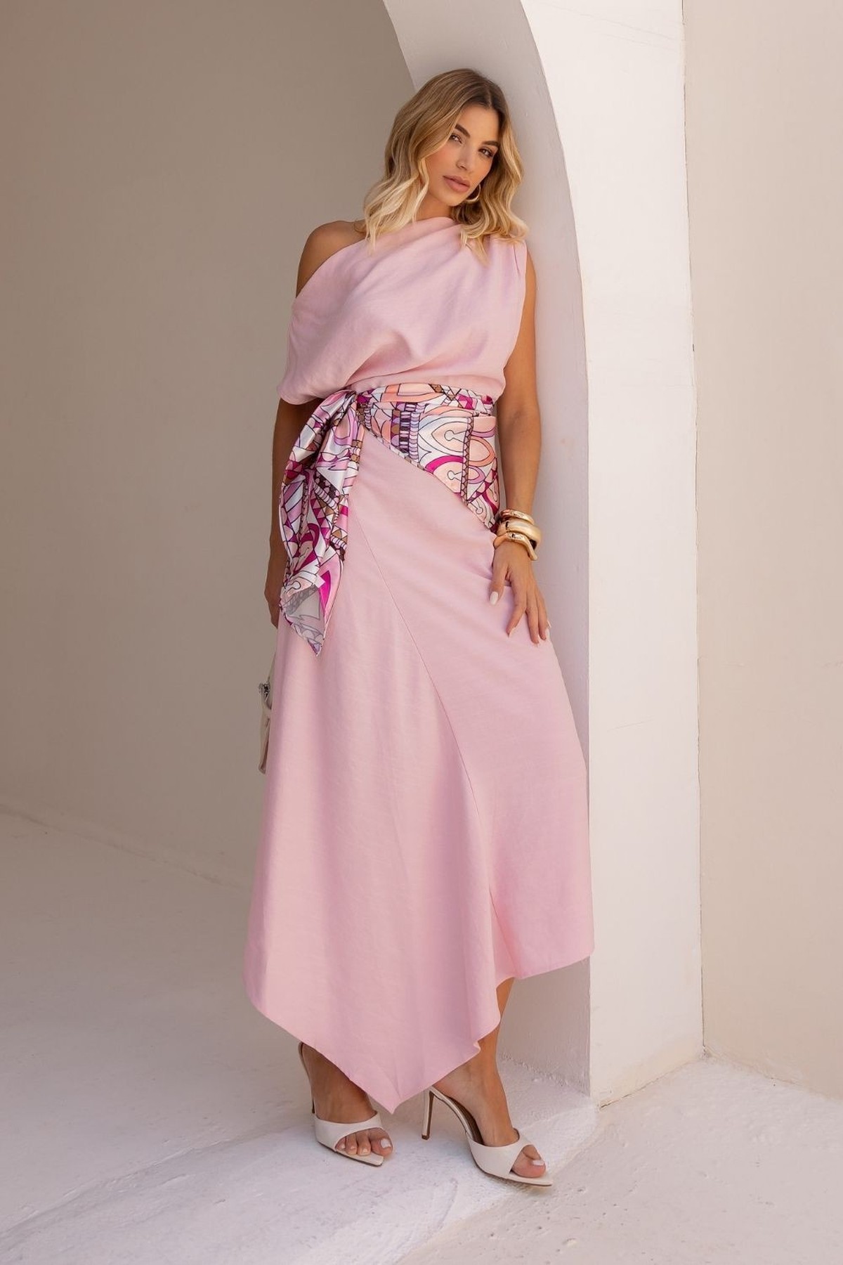 Modelagem assimétrica e decote ombro a ombro